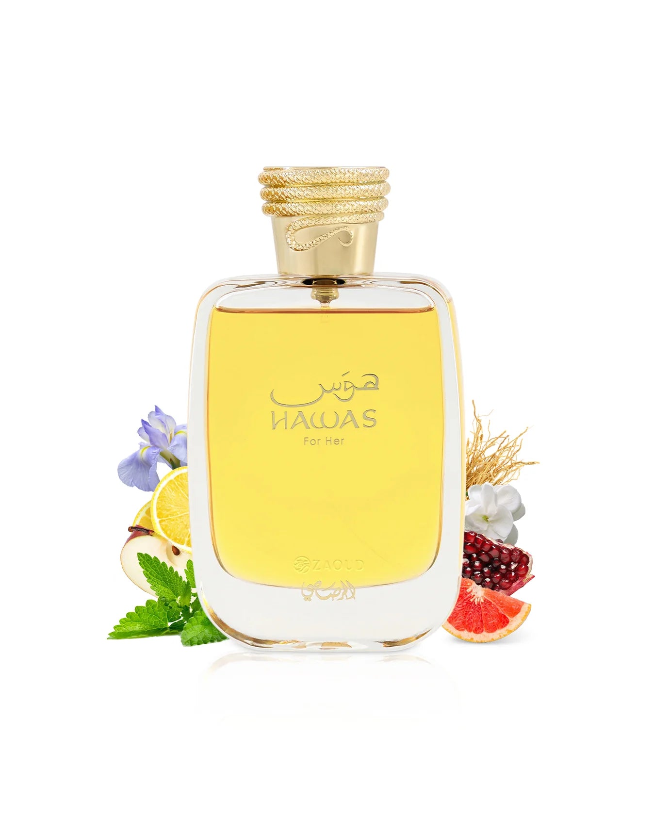 Un viaje olfativo cautivador: notas y acordesHawas for Her es una fragancia floral amaderada y gourmand cuidadosamente compuesta. Diseñada para transportar a quien la usa a un viaje chispeante, floral y profundamente sensual. Una salida cítrica y afrutada: La fragancia irrumpe con una vibrante y deliciosa mezcla de granada jugosa, manzana roja crujiente y pomelo chispeante. Esta explosión inicial es refrescante y vibrante, creando una sensación inmediata de elegancia juguetona y encanto irresistible. El elegante y floral corazón : Al asentarse la fragancia, emerge un rico y delicado bouquet floral. El corazón está dominado por el sedoso y embriagador aroma del jazmín sambac, complementado por la elegante y atalcada elegancia del iris y un toque de cítricos vibrantes. Esta combinación crea un núcleo sofisticado, refinado y maravillosamente femenino, delicado e imponente. Una base cálida y adictiva : La esencia de Rasasi Hawas for Her reside en su fondo. Se asienta sobre una base cálida, terrosa y gourmand de cremoso praliné, rico pachulí y vetiver intenso. Esta base le da a la fragancia su longevidad y su carácter adictivo. Se asienta en una estela reconfortante y seductora que deja una huella imborrable.